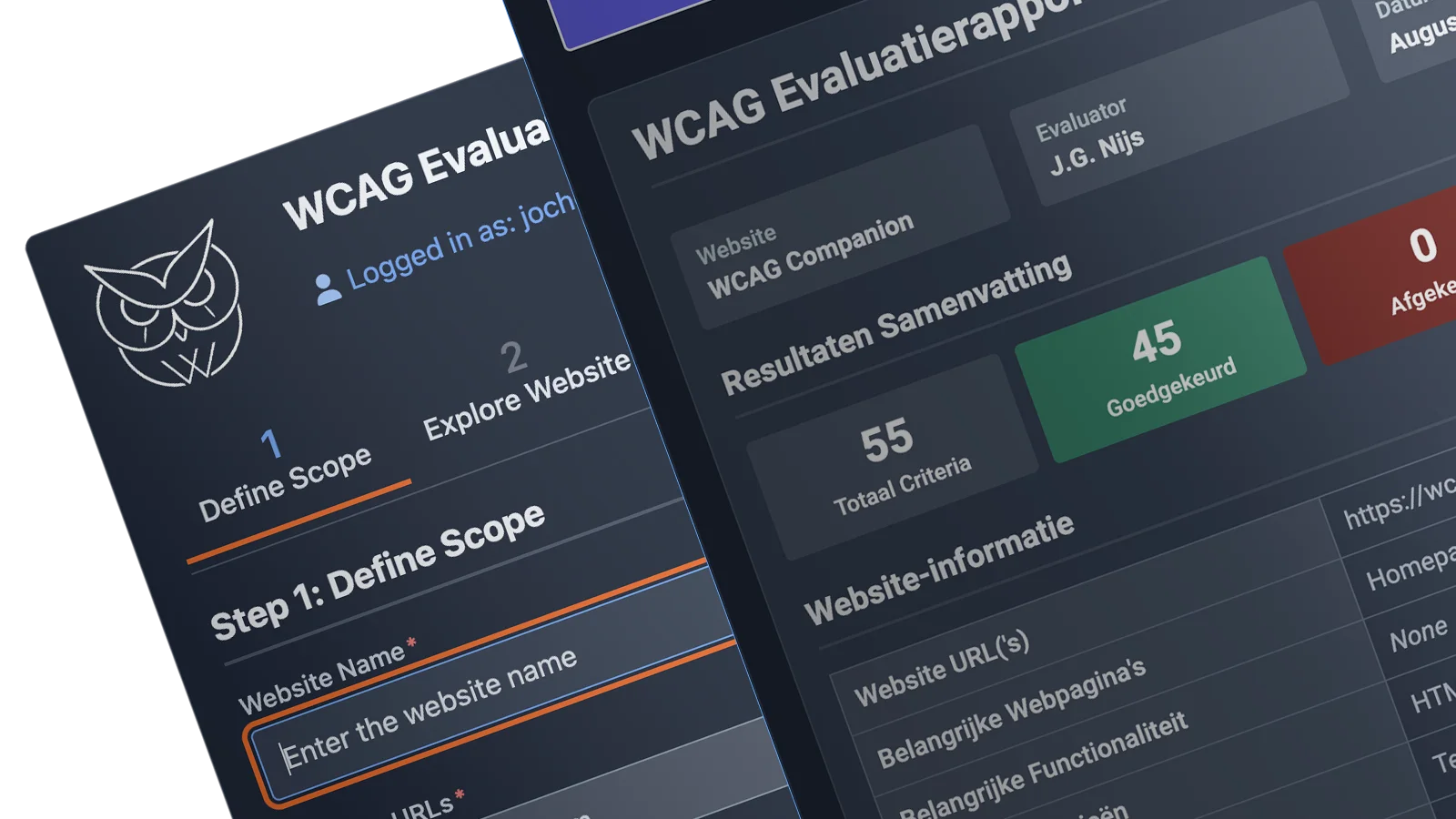 Core requirements: Comprehensive WCAG evaluation documentation, multi-format report generation, EU compliance features, and professional-grade interface design.